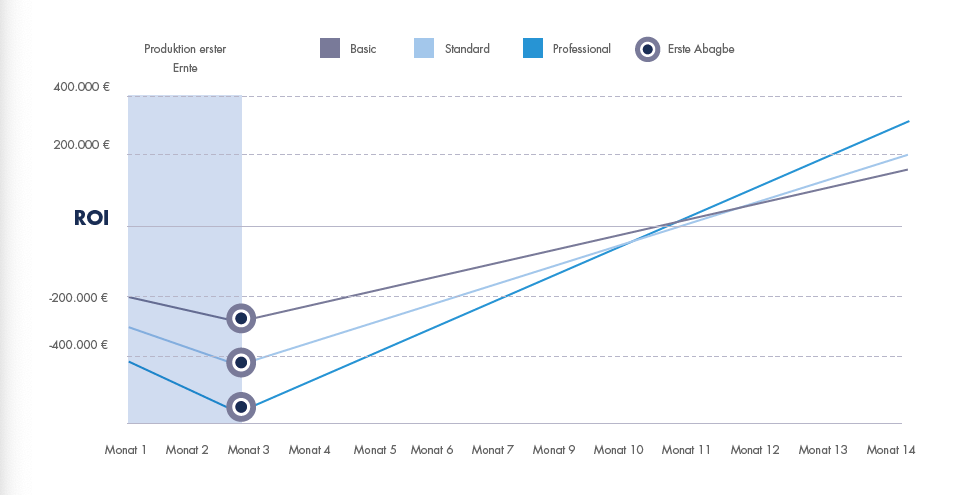 Berücksichtigt man, dass nach dem initialen Investment zusätzlich die Produktionskosten für die Produktion der ersten Charge vorfinanziert werden müssen und dadurch das verfügbare Kapital weiter sinkt, amortisiert sich die Investition in die hohe Ausbaustufe bereits nach wenigen Ernten. Somit unterscheiden sich – solange man das zusätzlich produzierte Cannabis verkauft – die Rückzahlungszeiträume der einzelnen Ausbaustufen nicht groß voneinander. Nach dem Erreichen des ROI wird man durch effizienteren Betrieb und niedrigere laufende Kosten in der höheren Ausbaustufe weiter Ausgaben sparen und durch höhere Erträge mehr Einnahmen generieren, was zu höheren Betriebsergebnissen führt.