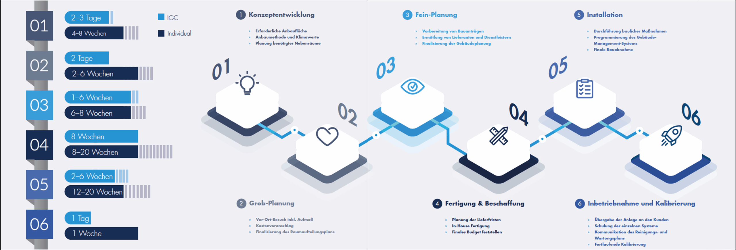 Liegt eine Umnutzungs-Genehmigung vor, kann eine Anlage bestehend aus IGCs bei sehr zeitkritischen Projekten initial in kurzer Zeit auf Ausbaustufe »Basic« errichtet werden und ein Upgrade auf »Standard« oder »Professional« vorgenommen werden, sobald die Baugenehmigung für die Aufstellung von Klima-Außengeräten etc. vorliegt.