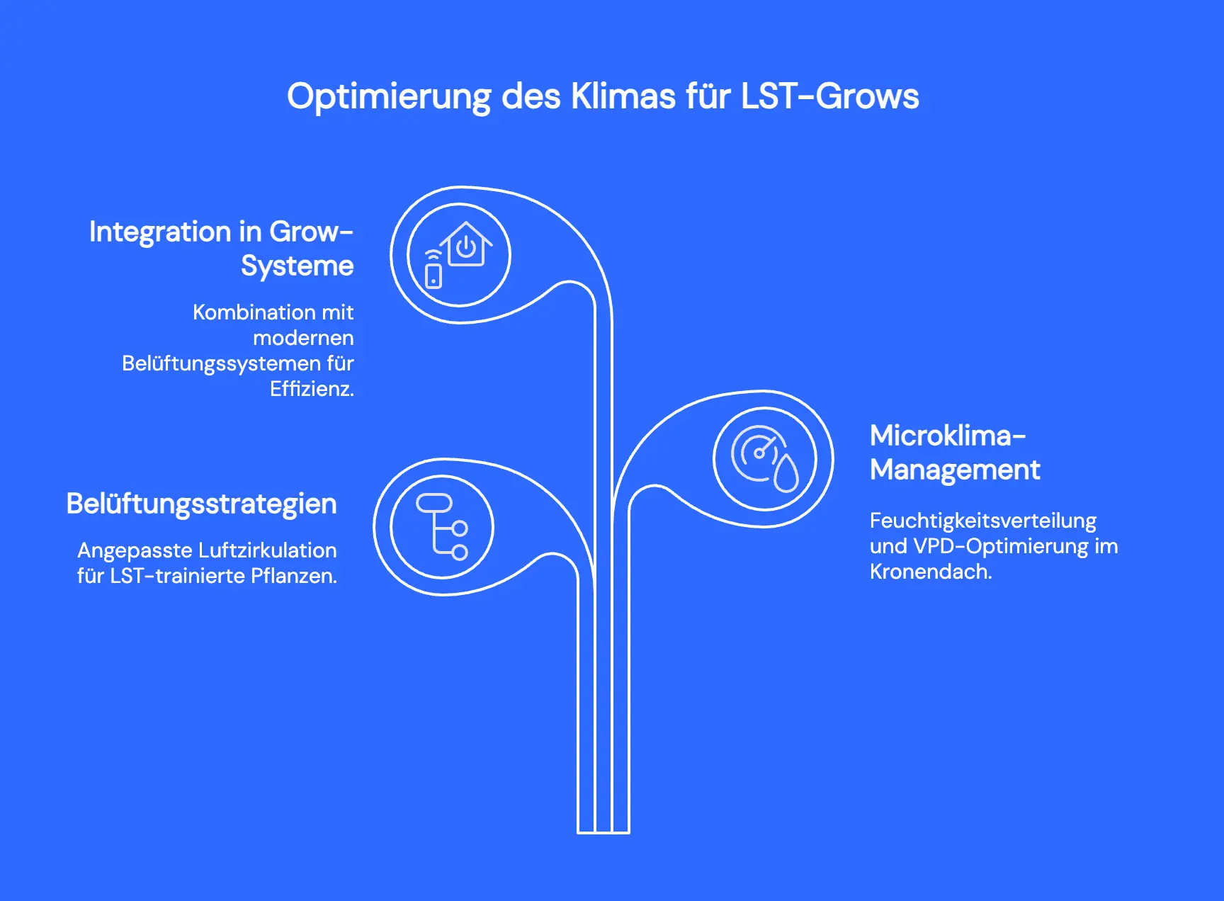 Kritisch wichtig! LST-Pflanzen haben größere Oberflächen und dichtere Kronendächer. Sie benötigen 20-40% mehr Luftzirkulation als untrainierte Pflanzen. Professionelle EC-gesteuerte Systeme mit variabler Geschwindigkeit sind ideal.