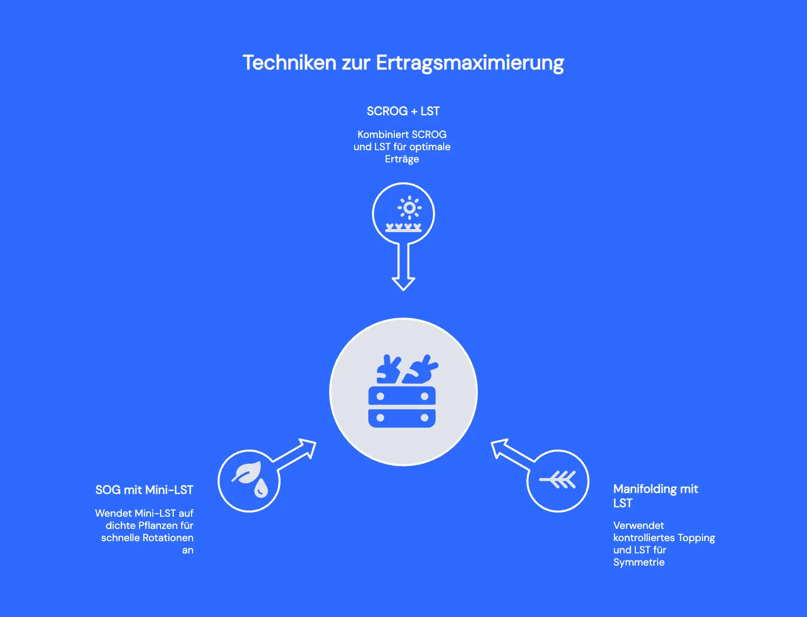 Ja, LST lässt sich hervorragend mit anderen Methoden kombinieren. Besonders bewährt sind LST + SCROG, LST + Manifolding und LST + selektive Entblätterung. Wichtig ist die richtige Reihenfolge: Erst LST etablieren, dann zusätzliche Techniken integrieren.