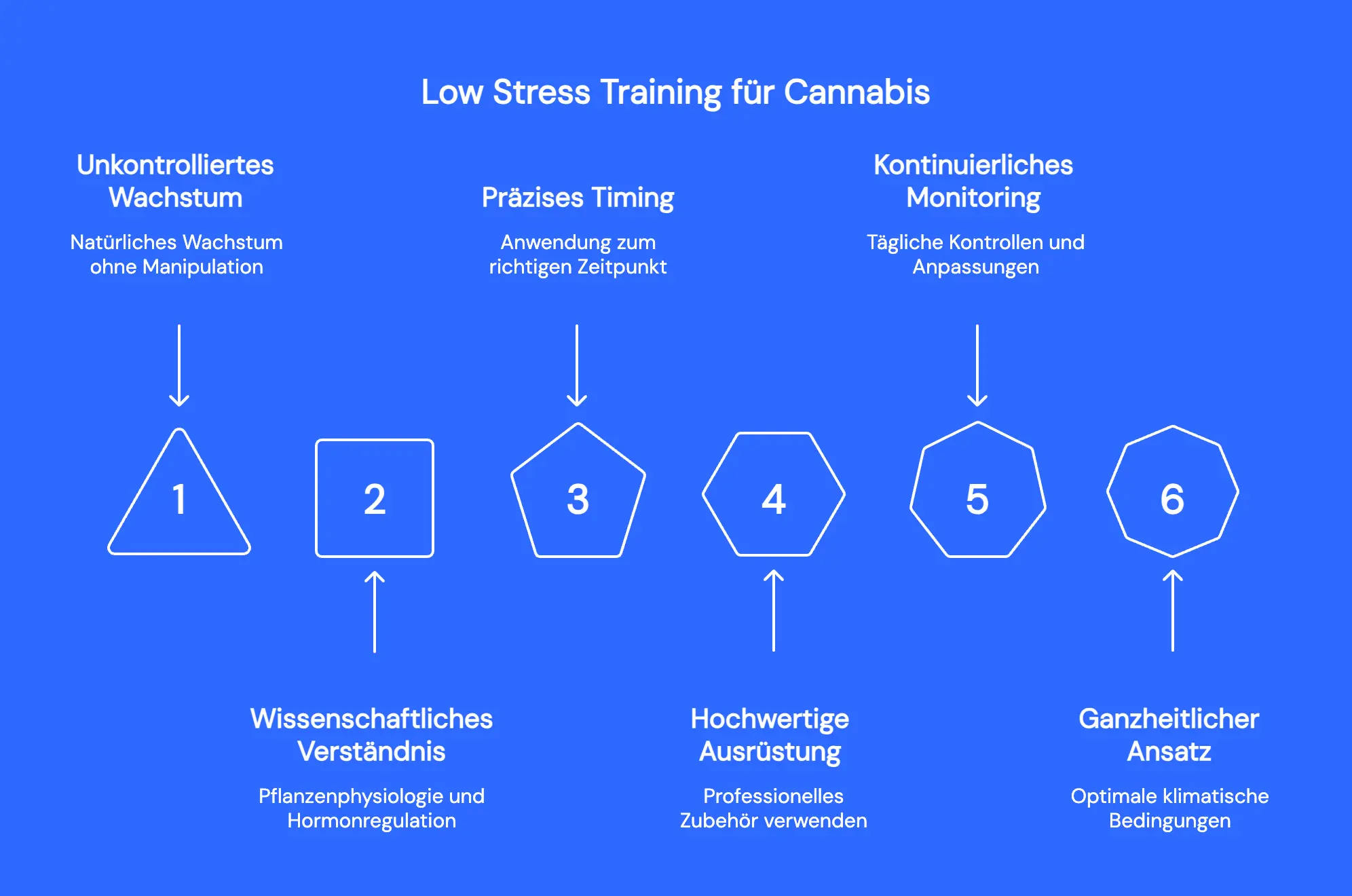 Diese professionelle Low Stress Training Anleitung basiert auf bewährten Protokollen aus kommerziellen Anbaubetrieben und wurde für verschiedene Erfahrungsstufen optimiert.